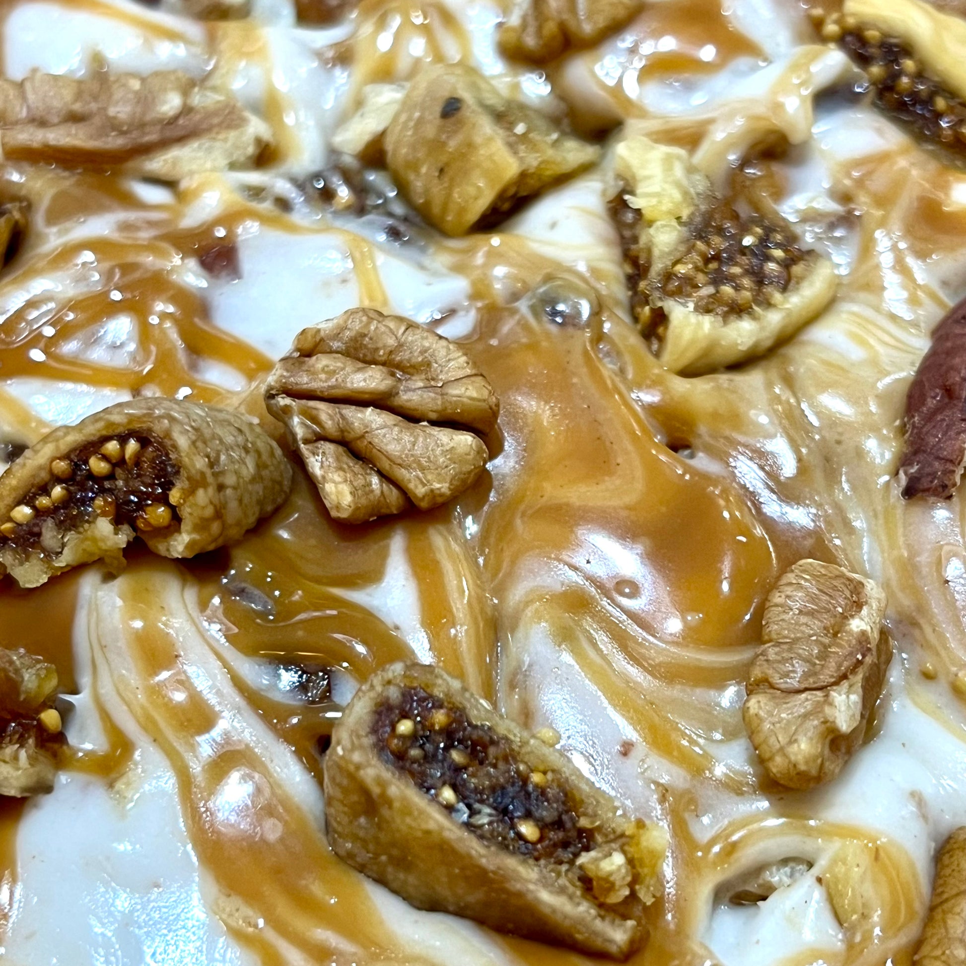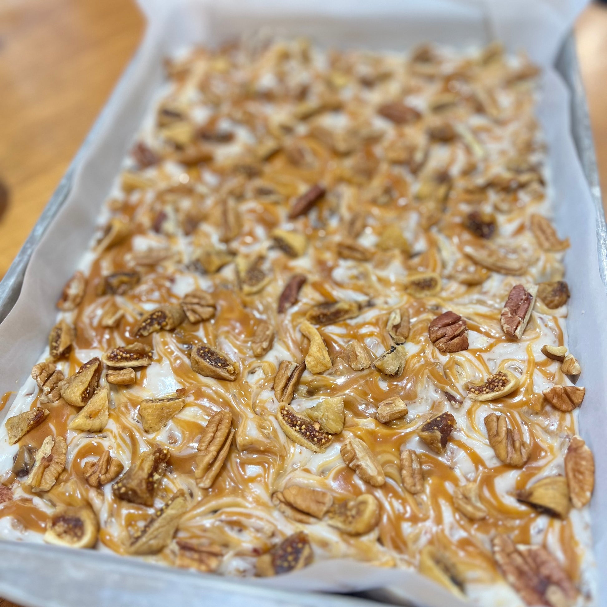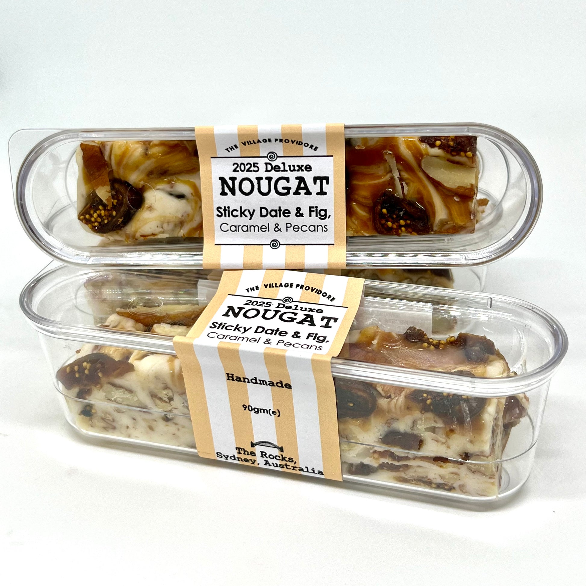Our nougat tribute to indulgent sticky date and fig pudding. Rich sticky dates enhanced with sweet figs and studded with buttery roasted pecans combined with our smooth and delicious handmade nougat, topped with lashing of soft figs and sticky caramel.