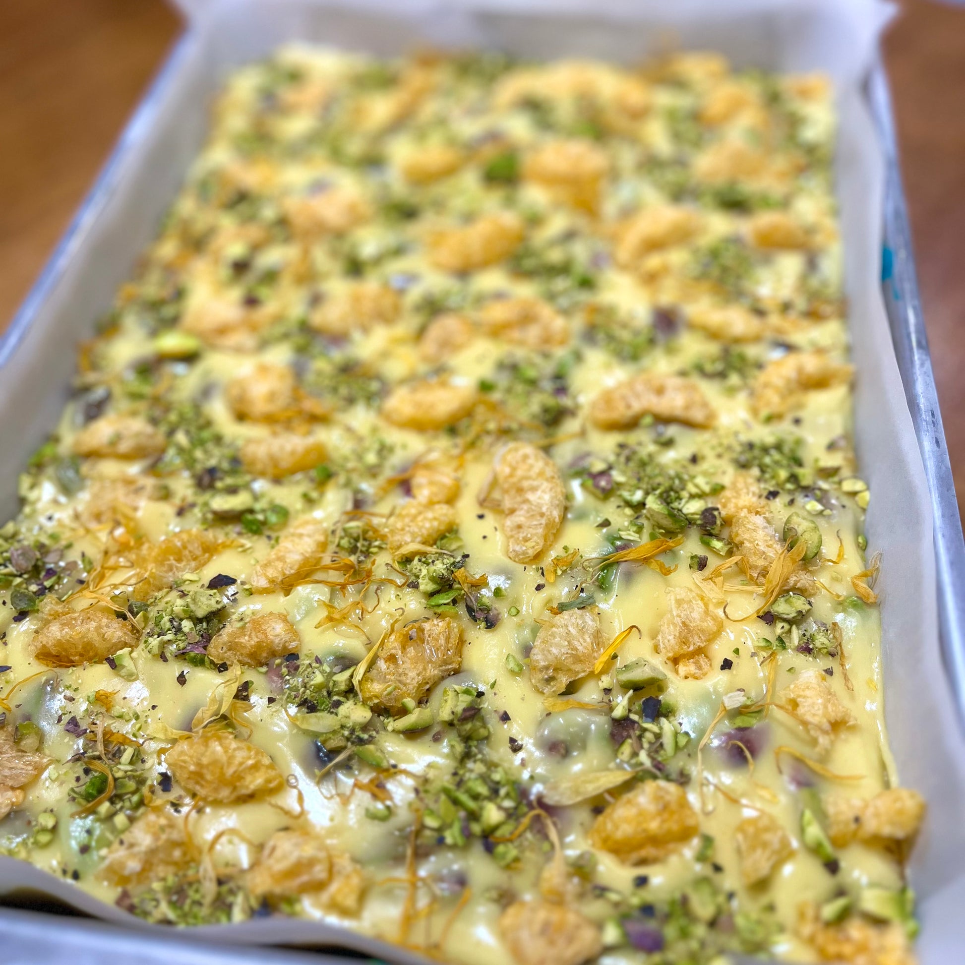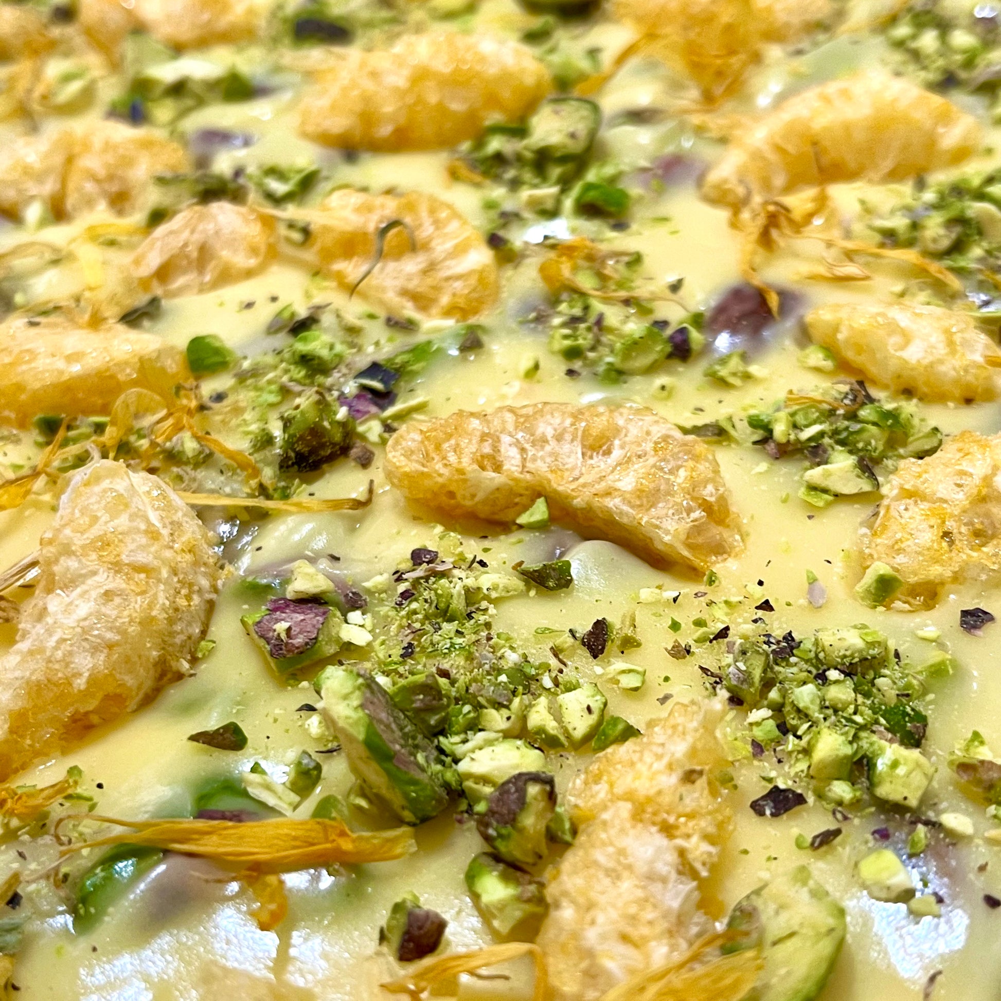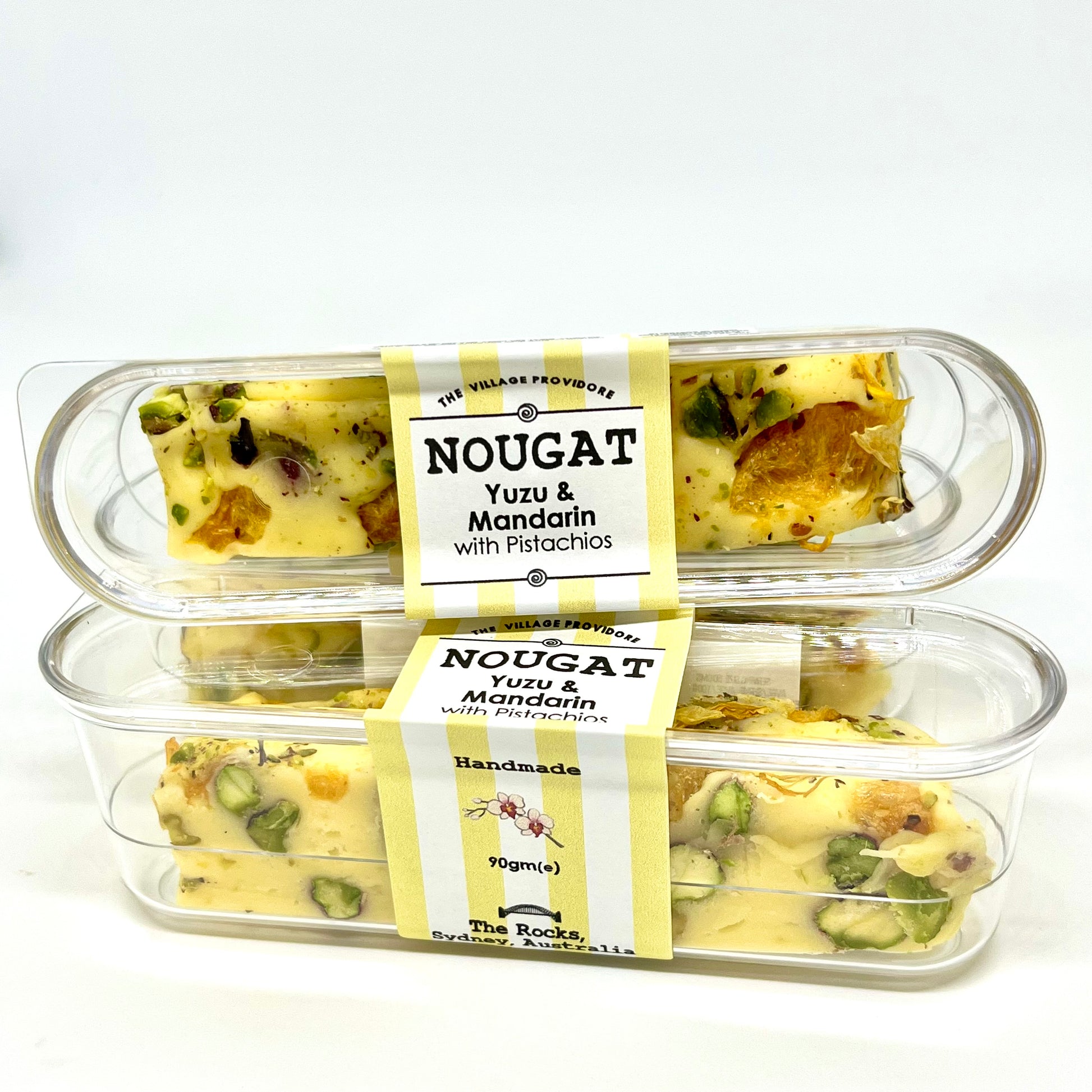 Our nougat tribute to sophisticated Asian citrus. Aromatic yuzu balanced with freeze dried sweet mandarin, and studded with premium roasted pistachios combined with our smooth and delicious handmade nougat.